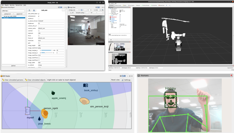 You can make use of the standard ROS2 tools visual interfaces, such as ROS’s RQt or ROS’s RViz to visually inspect the data from the robot. You can also use the custom tools that we provide to visualize human related data, as detailed in Tooling and debugging of human-robot interactions.