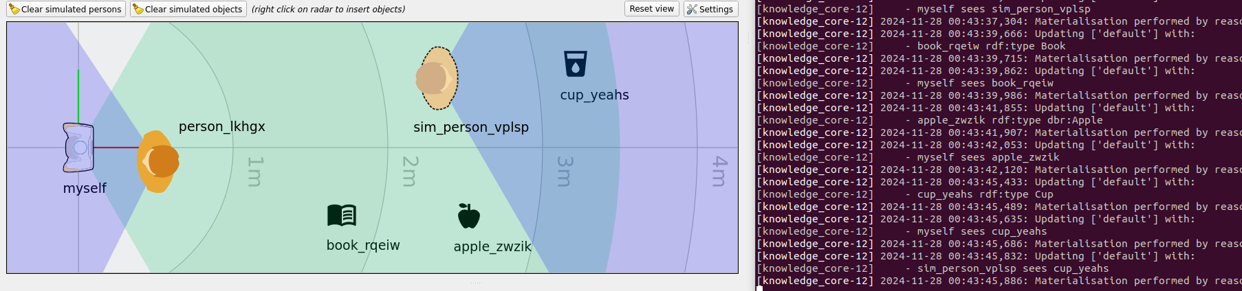 It will drop the object at the designated location. The green zone is the field of view of the robot, and blue zones the field of view of the humans (with the darker orange being the detected real user, and lighter orange being a virtual human just added). Once you add an object, it will be automatically added on robot’s knowledge base.