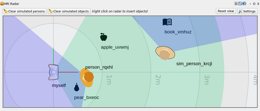 The Human Radar component displays (and optionally simulate) humans in the vicinity of the robot. It provides spatial data, including distance and angle relative to the robot.