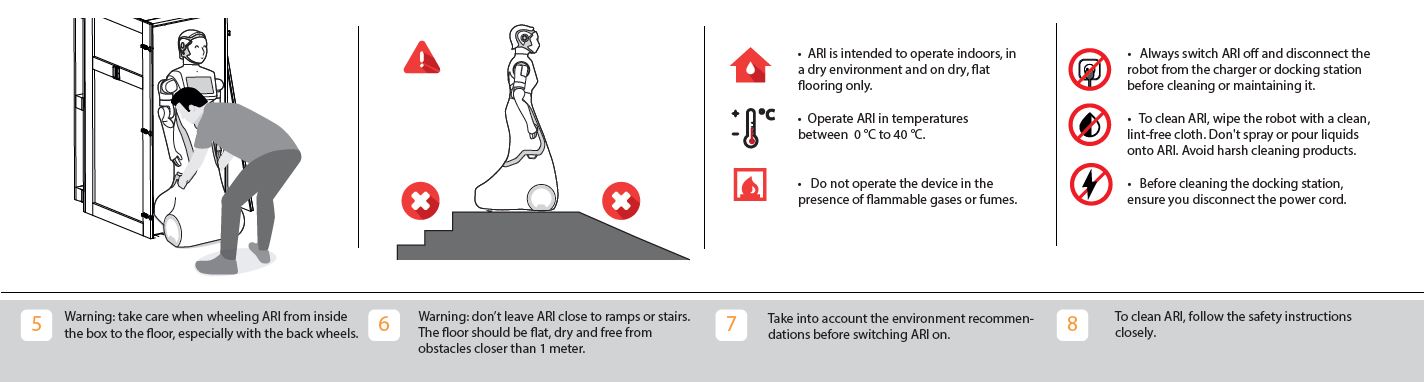Don’t leave ARI close to ramps or stairs. The floor should be flat, dry and free from obstacles closer than 1 meter.
