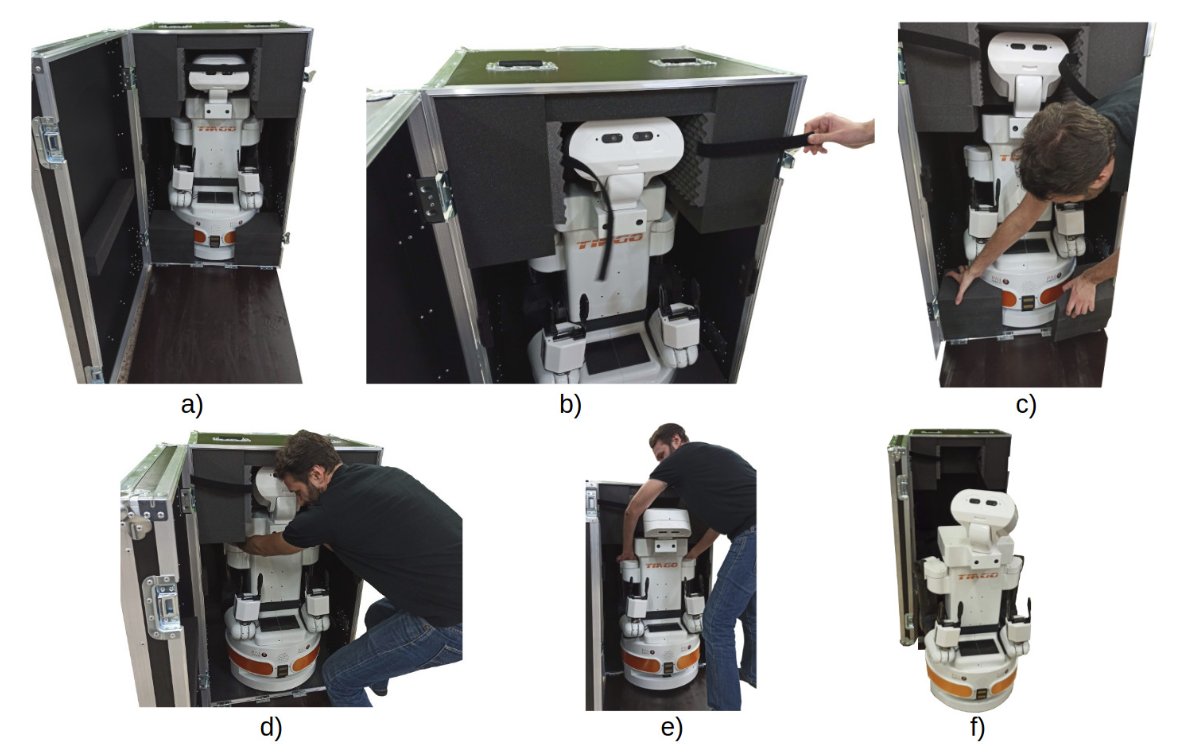 Open the door of the crate, see figure a), and unfold the ramp as shown in figure b). Remove the foam wedges holding the mobile base as shown in figure below c). Finally, pull out TIAGo from the upper part of its torso back and, if necessary, from the bottom part of the shoulder, as shown in figure d). Do not pull out the robot from any part of the mobile base cover as damages could be caused to you or to the robot.