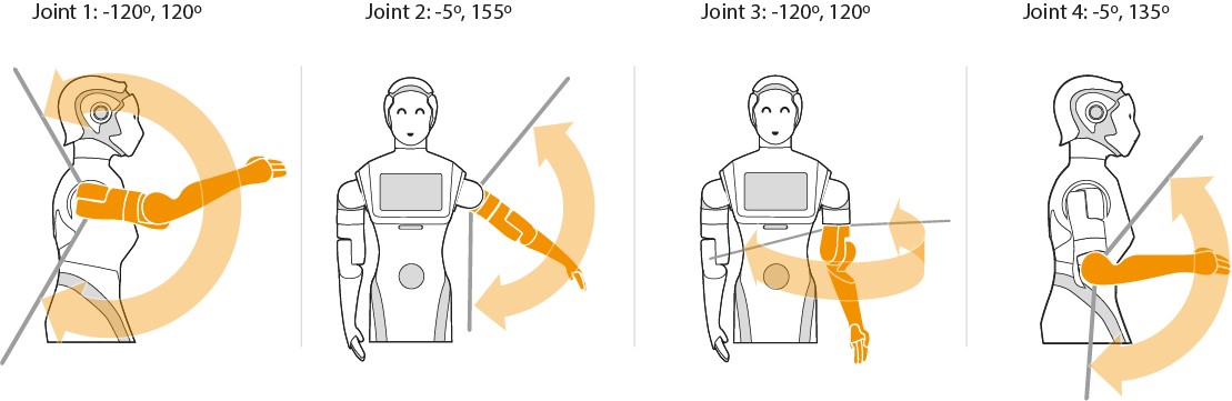 ARI has LCD eyes which provide a collection of eyes expressions. These can be use to support engaging interactions, along with head and arms movements.