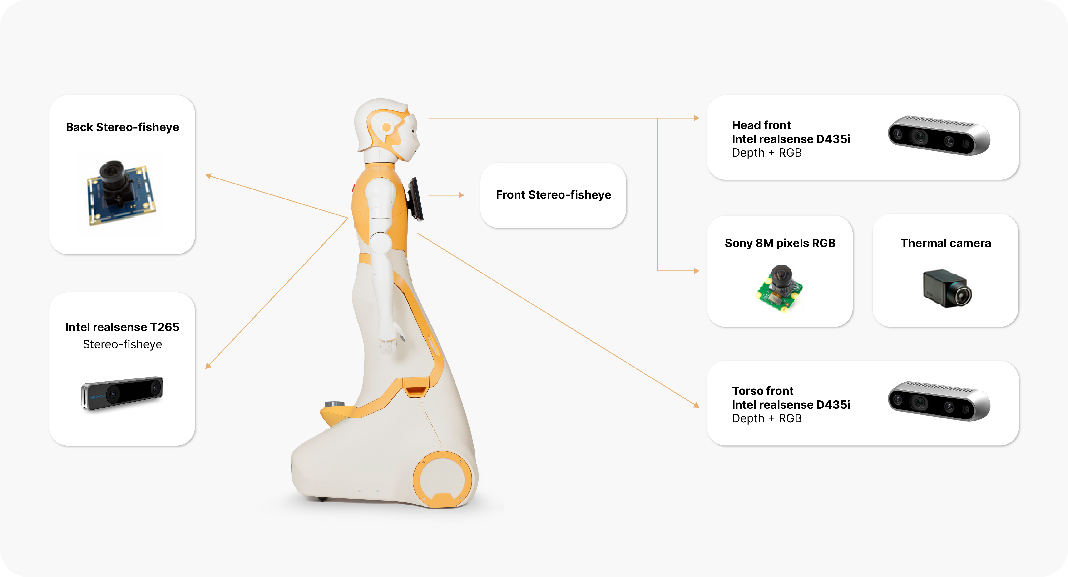 Stereo-fisheye camera: This camera is mounted on the back side of the torso, right below the emergency button, and provides stereo, fisheye and black and white images.