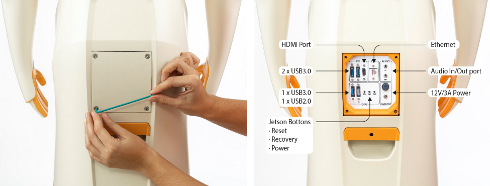 The expansion panel is at the back of the robot. It provides access to the following additional connectors: