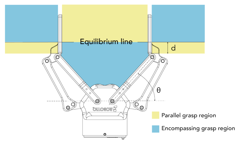 The gripper equilibrium line is the grasping region that separates the encompassing grasp from the parallel grasp. When grasping an object close enough to the inside (palm) of the gripper, the encompassing grasp will occur (unless the object size or shape is not adequate) and the fingers will close around the object.