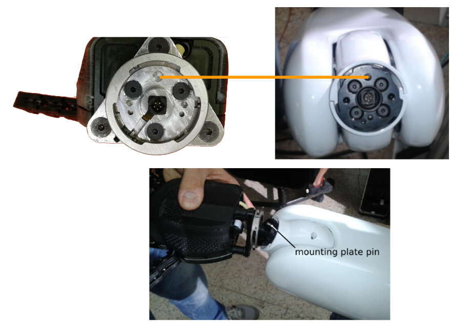 Position the end-effector on top of the wrist mounting plate so the plate pin fits in the corresponding hole of the end-effector plate, see the figure below.