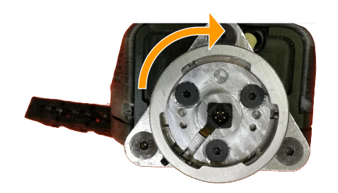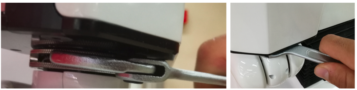 If the clamp cannot be unlocked by hand, use the tool provided with the spare end-effector, see the figure below. Insert the tool in the groove edge of the clamp and rotate it counterclockwise in order to unlock it, as shown in the figure below.