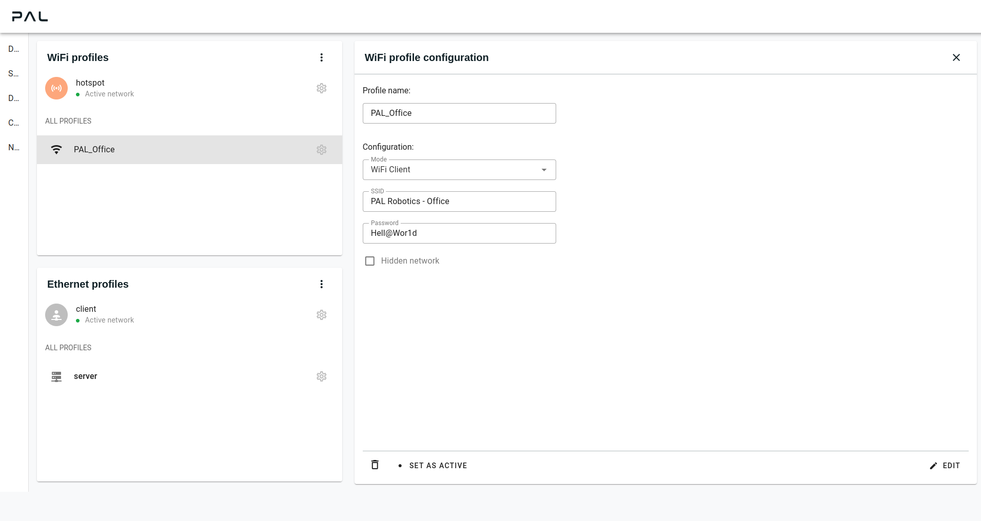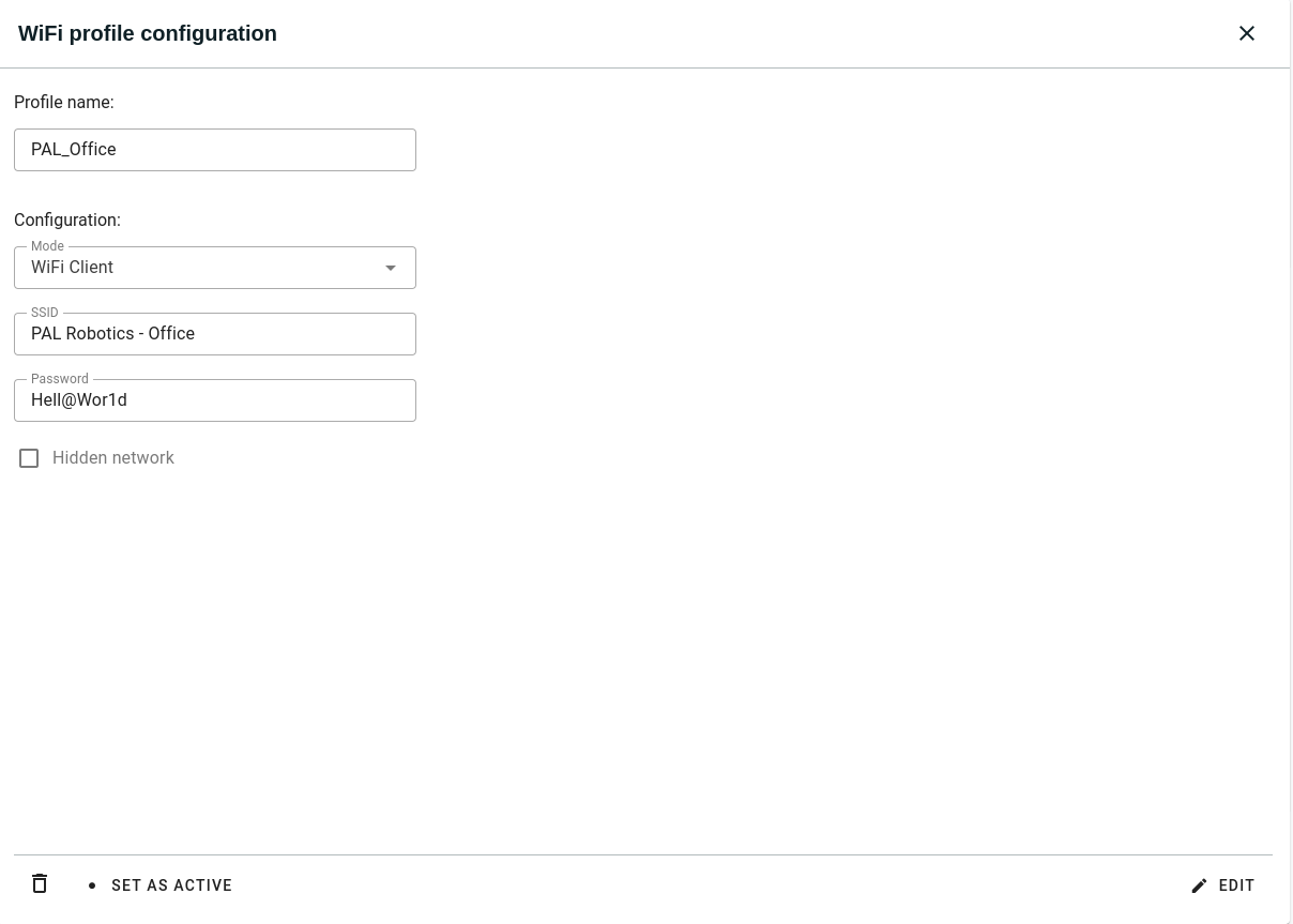 $ pal network set wifi --profile-path /etc/netplan/pal/50-wifi-hotspot.yaml