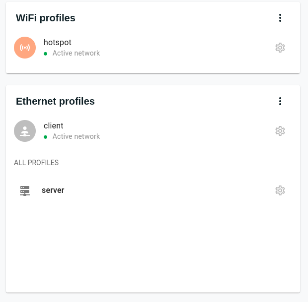 System-provided default profiles cannot be edited or deleted. These include: - WiFi: hotspot - Wired: server, client