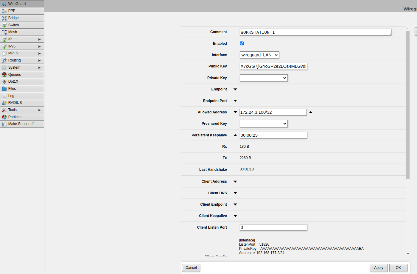 In the Allowed Address field, enter the WireGuard IP address assigned to your workstation. This address should be in the format 172.24.X.Y/24, where X corresponds to the WireGuard network of the robot and Y is the octet designated for your workstation.
