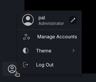 Left-side menu: Contains an account button with options such as password management and UI preferences (e.g., Dark/Light mode). It also contains a list of available web apps, which can be accessed by clicking on them.