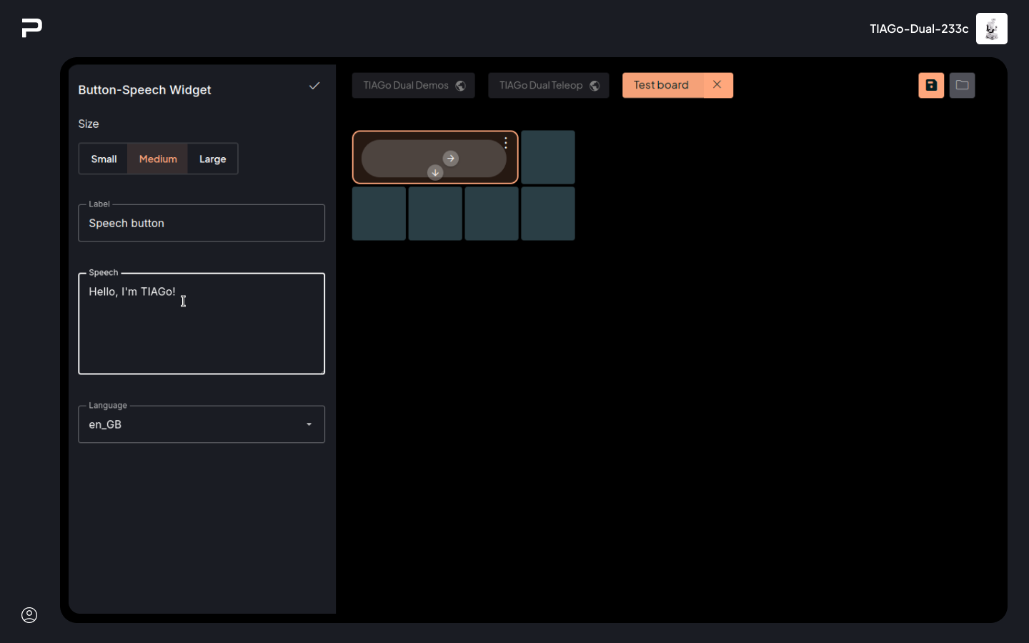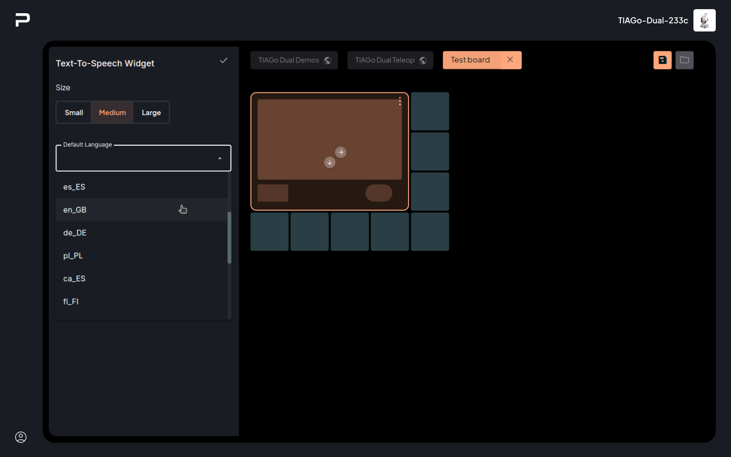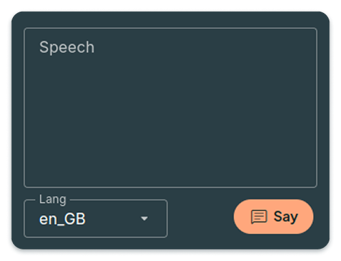 The Text To Speech Widget allows the user to write a sentence dynamically and have it said by the robot. The sentence can be written in the main area, and the language selected on the dropdown below.