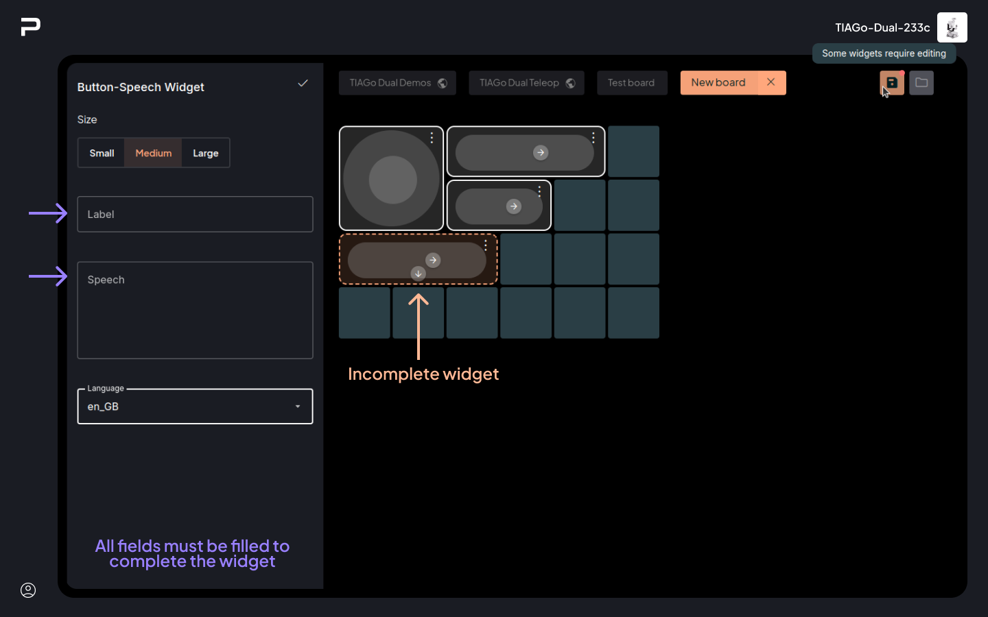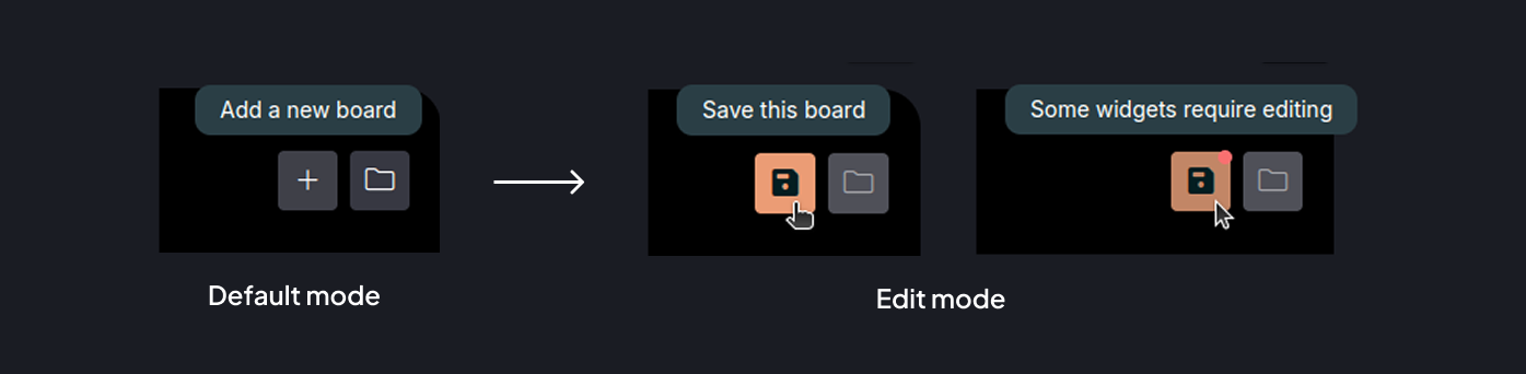Finally, for widgets that are invalid, either because of missing or incorrect data, will be shown with a dashed border. Boards can’t be saved when they are empty, or while they contain invalid widgets.