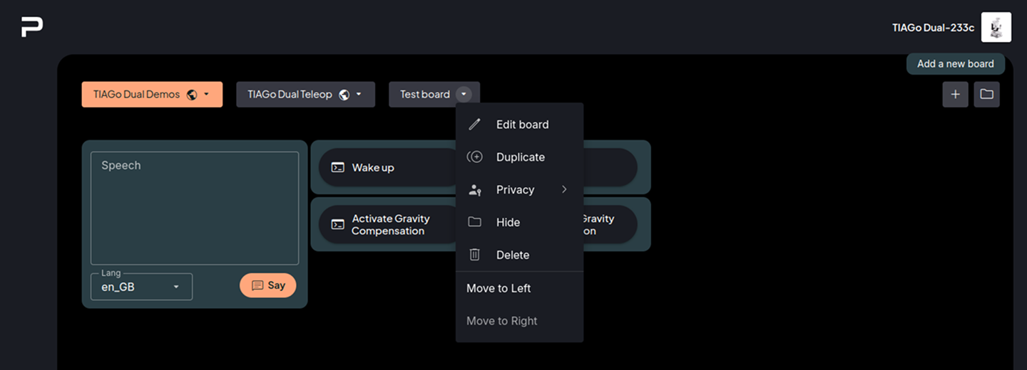 The Boards app offers many widgets, availability depends on the robot characteristics.