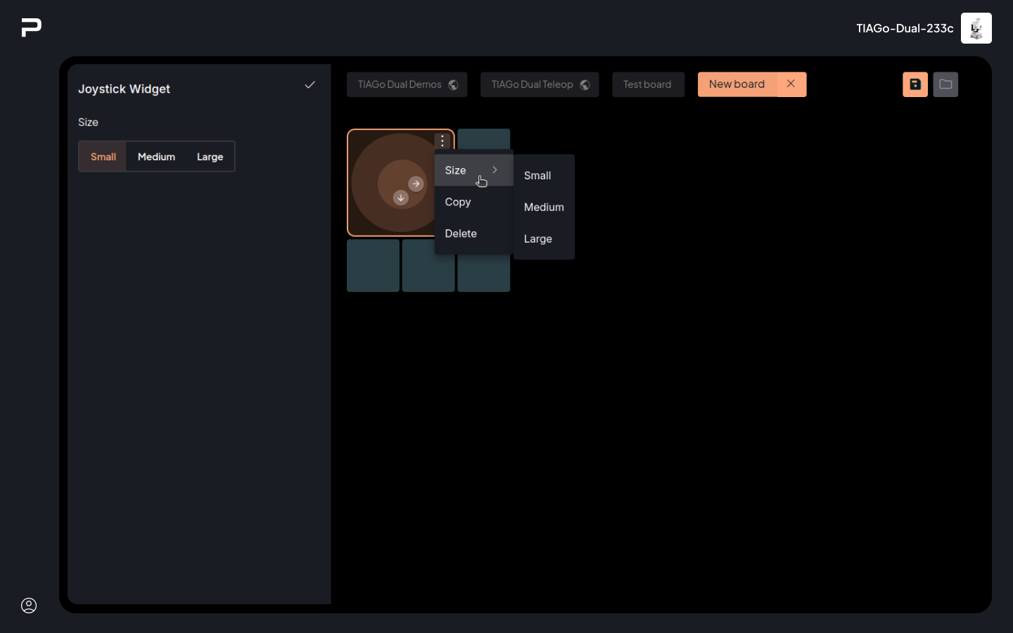 A small context menu can be accessed from the button on the top right corner. This menu allows changing size (as long as the new size is valid), copying the widget and removing it from the board. To paste a copied widget click on any empty cell, and choose the “Paste Widget” option. This option will be disabled if there is not enough space to paste that widget.