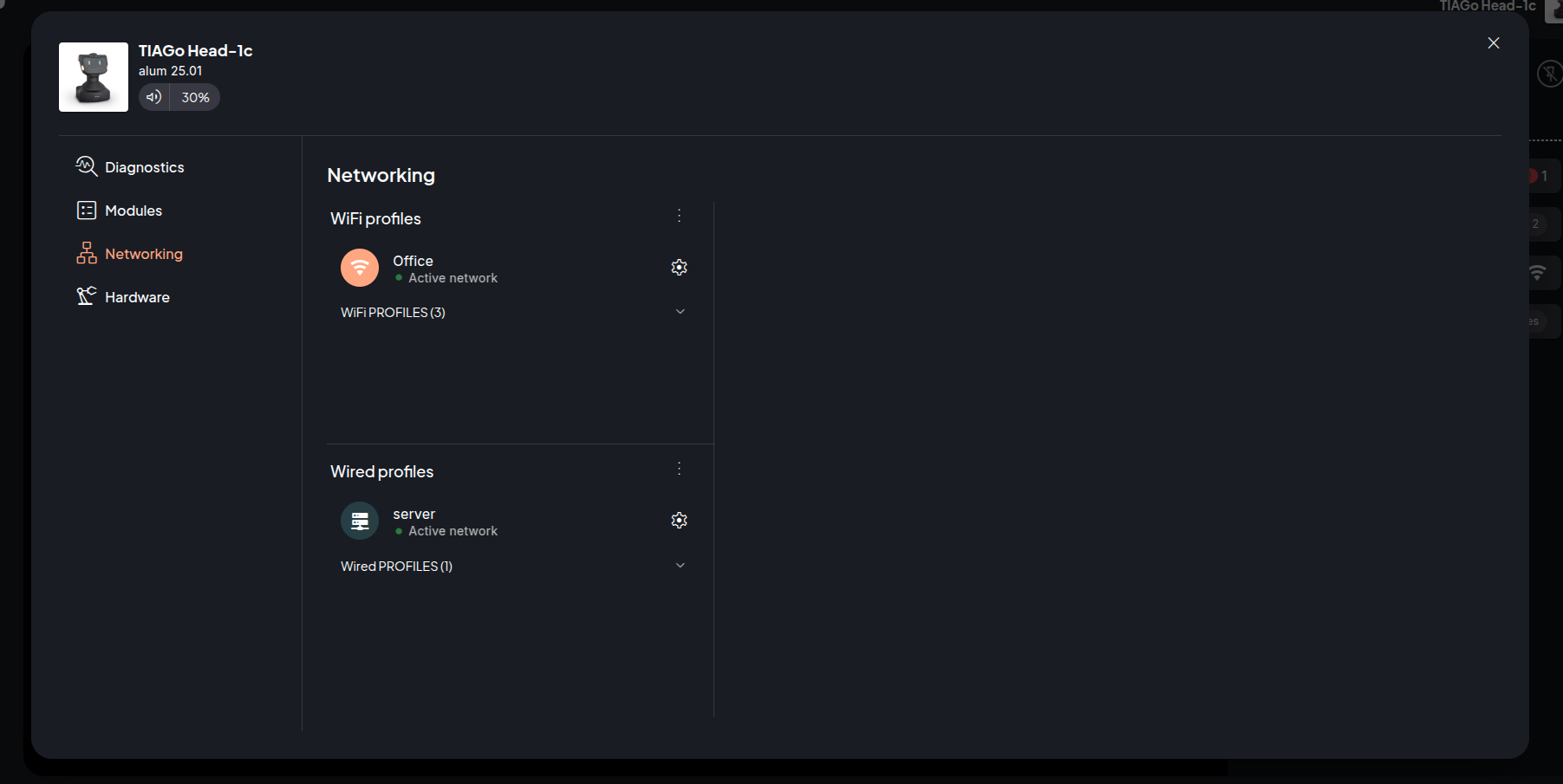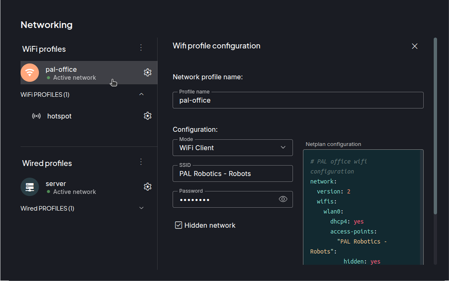 The robots use Netplan, a utility for networking configuration on Linux systems. The Networking application provides an easy to use interface to manage the Netplan configuration files (YAML).