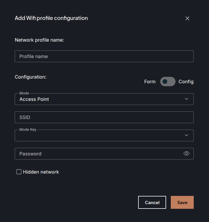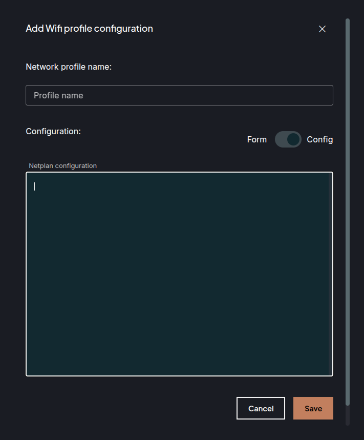 You can edit the configuration of an existing profile (unavailable for default profiles). In case of WiFi the fields will be shown to be edited if the edit tools was Fill form or the YAML code will be shown to be edited in case the edit tool was Insert configuration or the profile is of ethernet type. After making changes click Save.