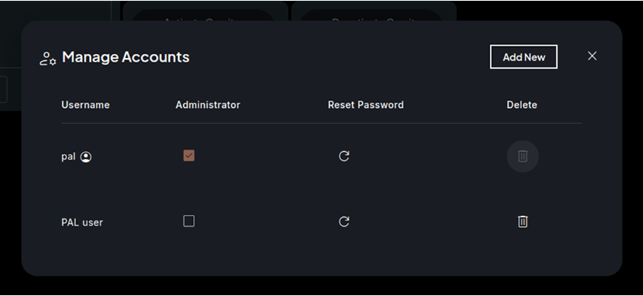 When accessing the WebGUI, a username and password will be required. The default credentials are pal / pal. You may be provided with your own user account, or you can create new user accounts from any account with administrator privileges. Check User management for more details.