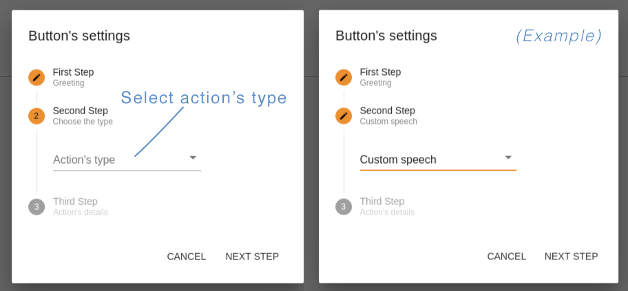 Step 2. Action’s type. You can create buttons with “Motion” type, corresponding to the blue circles, so that the robot makes a movement; or “Custom Speech type”, which is represented by an orange circle, so that the robot says the written text. In this example we chose “Custom speech”.