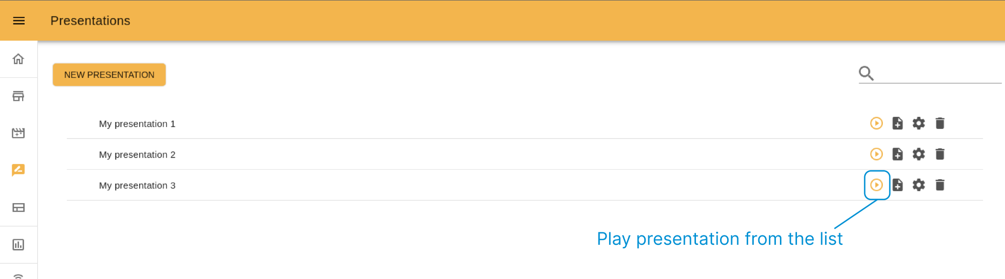 If you want to play the whole presentation from the start page, press the Play icon of the presentation from the list.