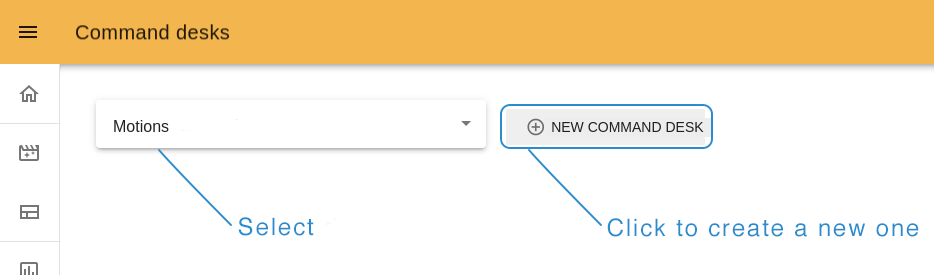 To create a new command desk click on the “NEW COMMAND DESK” button at the top of the page. Near it, at the left top corner menu, you can choose a Command desk created earlier.