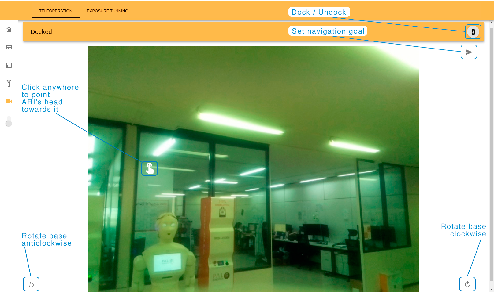 The Teleoperation tab allows you to see from the head camera’s point of view. With this display you can click anywhere on the image to have ARI look at that point, or, by clicking the navigate icon at the top right and then clicking on an empty spot on the floor, have ARI navigate to this position. The two arrow buttons allow for simple rotation of the base. In this tab you also can Dock/Undock the robot (see Dock/Undock through WebGUI for further information).