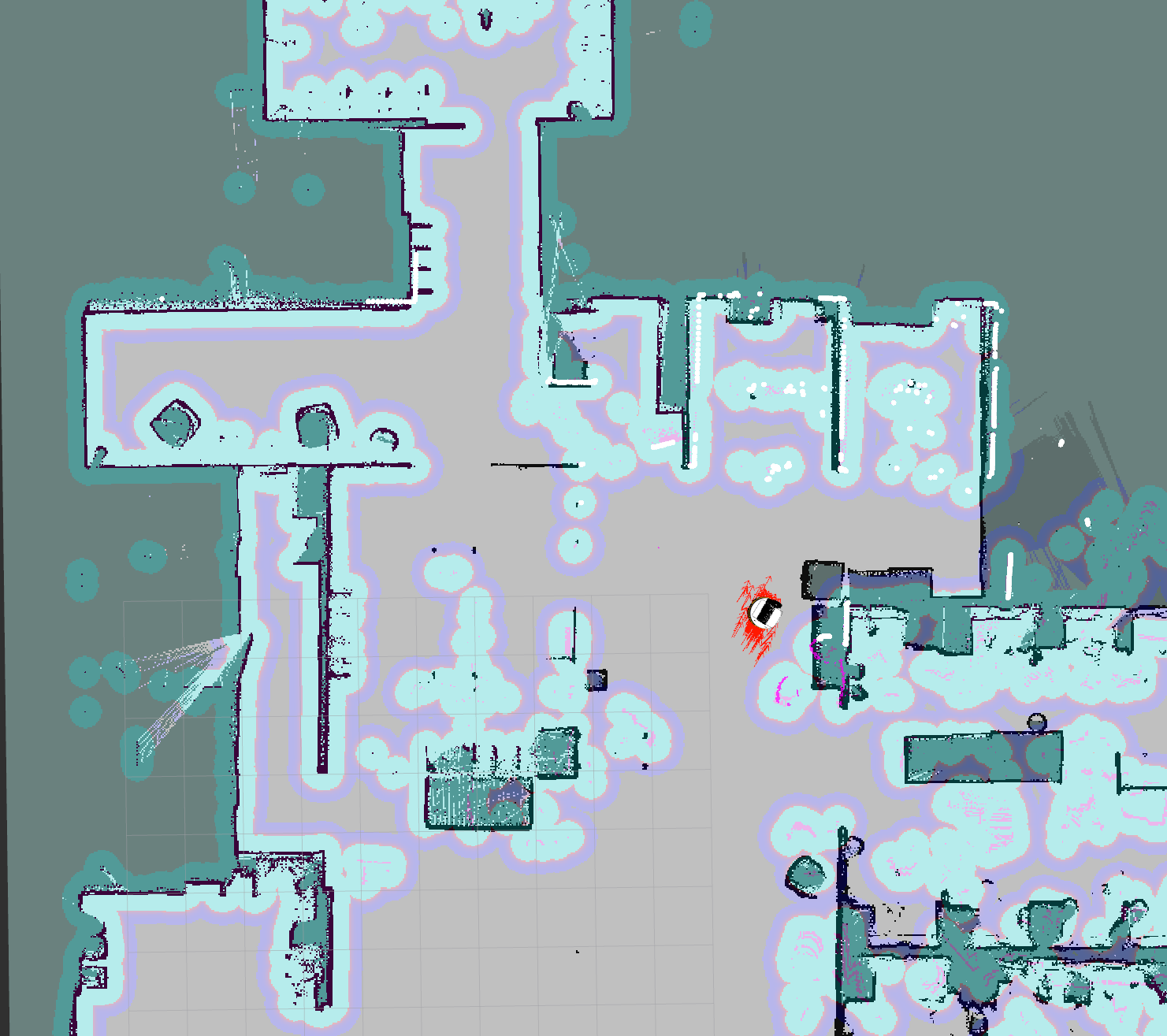 You can see that the robot is correctly localized in the map by observing the laser scan points (in white) and comparing them to the fixed obstacles in the map (in black). Their correspondance means that the robot is correctly localized in the map and can safely navigate in it.